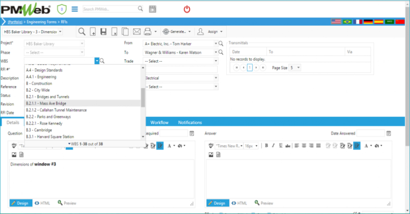 Engineering FormsTodos os documentos que necessários para gerenciar projetos, em um revolucionário design para Web. Drag & Drop para Relatórios diários e Punch lists; Criar relatórios em Rich Text Format sem sair do PMWeb; Vincular registros múltiplos agrupados para uma referência rápida; Colar do MS Word sem perda de formatação; Atribuir documentos aos calendários dos usuários; Mesclar para o MS Word, Excel ...• RFIs• Envios• Minutas de reunião• Listas de desenho• Conjuntos de desenho• Relatórios diários• Punch List• Transmissões• Itens de ação• Relatórios RTF