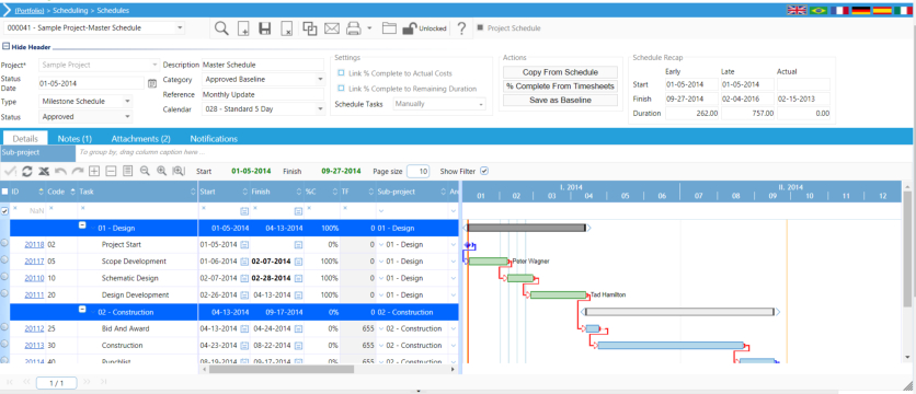 SchedulingO PMWeb oferece uma solução de agendamento completa com gerenciamento do caminho crítico, drag & drop de gráficos de Gantt, baseline e muito mais. O Scheduling, assim como todos os módulos PMWeb, é multiprojeto.Itens como a disponibilidade de recursos e as visualizações do Gerenciamento de portfólio de projetos (PPM) estão prontos para utilização out of box. Crie sua agenda dentro do PMWeb ou faça o link para MS Project e Primavera.• Análise de reivindicações - compare as programações entre períodos e / ou entre projetos• Links para Primavera P6 e Microsoft Project incluídos• Quadros horários que circulam para o módulo de gerenciamento de custos• Use o gráfico Gantt de forma interativa para vincular tarefas, insira status completo, tarefas de sinalizadoras e muito mais• Fluxos de caixa e relatórios de renda diretamente do cronograma• Porcentagem de base completa nas folhas de horas• Visualizar disponibilidade de recursos em todos os projetos e períodos